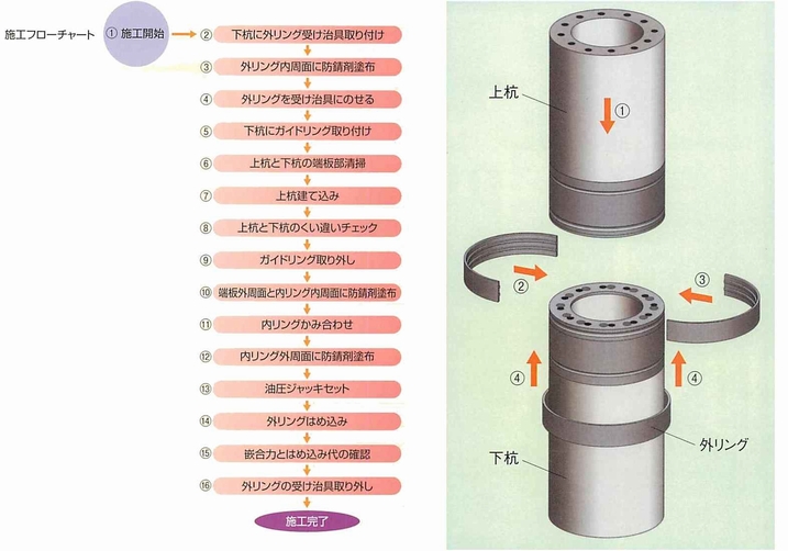 - 本継手は、端部金具、内リング及び外リングから構成されています。端部金具は、端板と補強バンドからできており、端板は上杭と下杭を突き合わせたときに内リングで挟み込むことのできる突起が付いた特殊な形状をしています。
